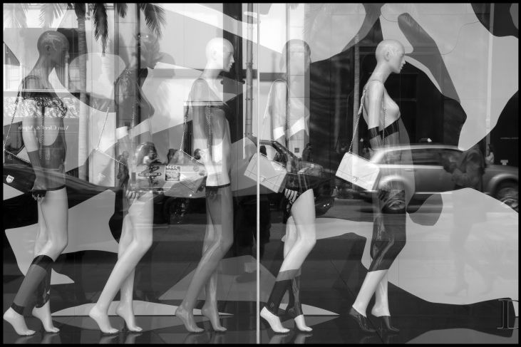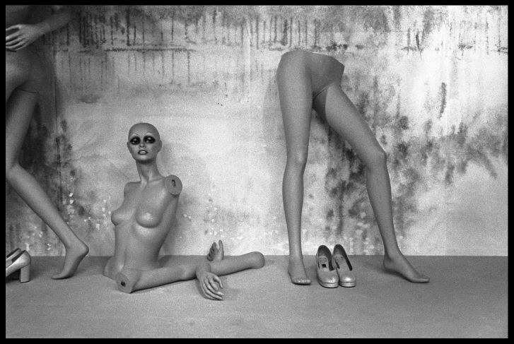 Here are some of Ave Pildas’s images; the bewigged head of a woman sitting in the shallow display space of a beauty school’s window; a black torso who’s most surprising detail is a barely visible belly button. The focus of these intensely packed photos is the ghostly, symbolic presence of the female body within the synthetic shell of a mannequin. Our minds reassemble the fragments of Pildas’s truncated female bodies; missing pieces don’t disturb us. Notably absent are those for whom this display exists – the men imagining the bodies beneath the clothes, the women fantasizing themselves wearing the clothes, or seeing within the blank mannequin an ideal version of themselves. –Kay Whitney Sculptor, Writer
